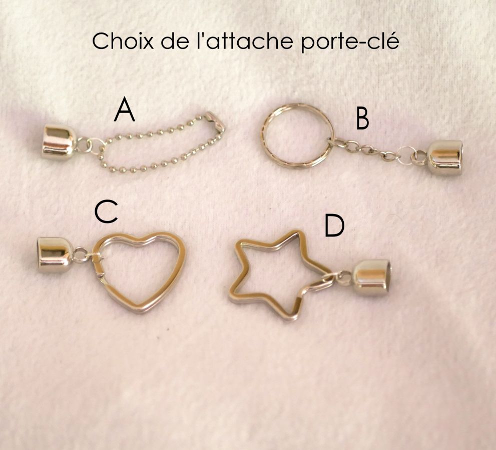 Choisissez l'attache du porte-clefs : en forme de coeur comme sur les photos, un en forme d'étoile ou une chainette en billes d'acier ou un classique cercle (tus 4 peuvent s'ouvrir pour s'attacher à un sac ou insérer des clefs).