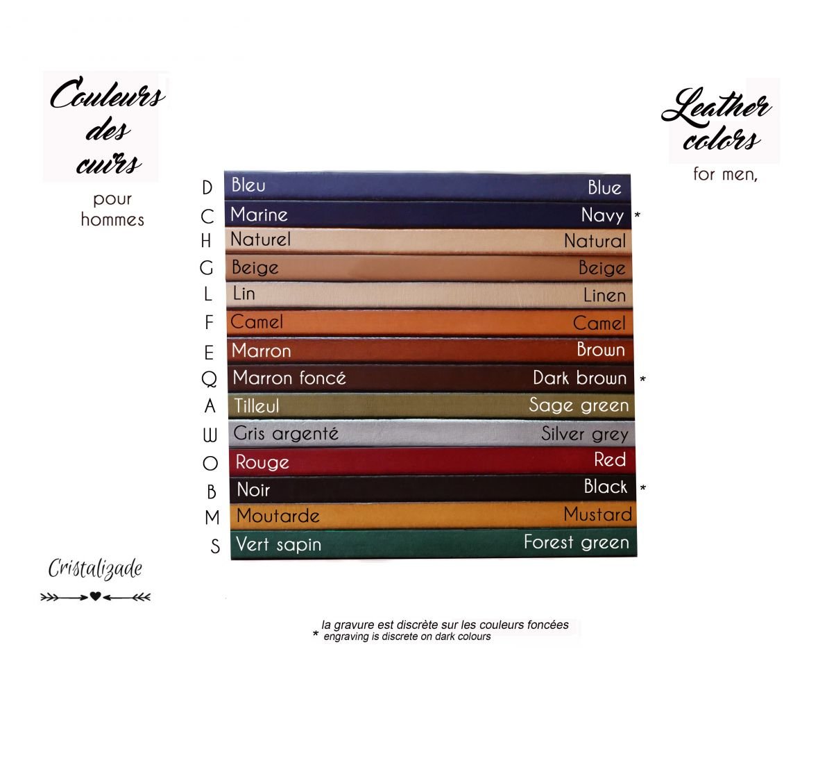 Notez que la gravure sur couleurs foncées est discrète (noir, marine, marron foncé) et qu'elle est bien visible sur les couleurs claires de cuir.