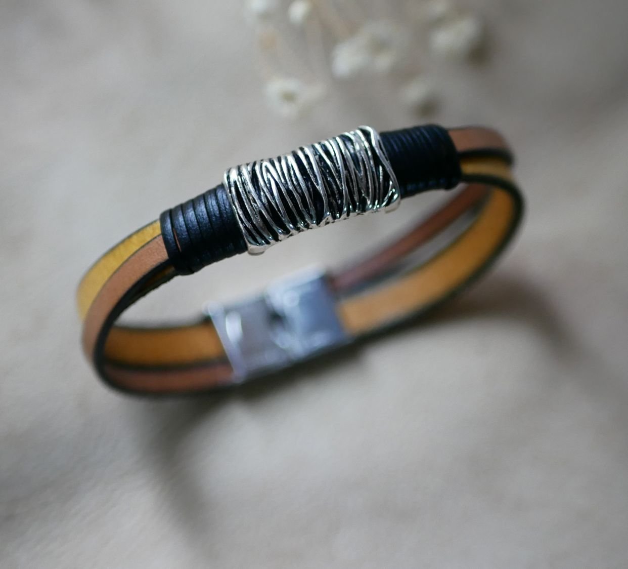 Les bracelets présentés sont en Moutarde+Camel et Noir+gris argenté.