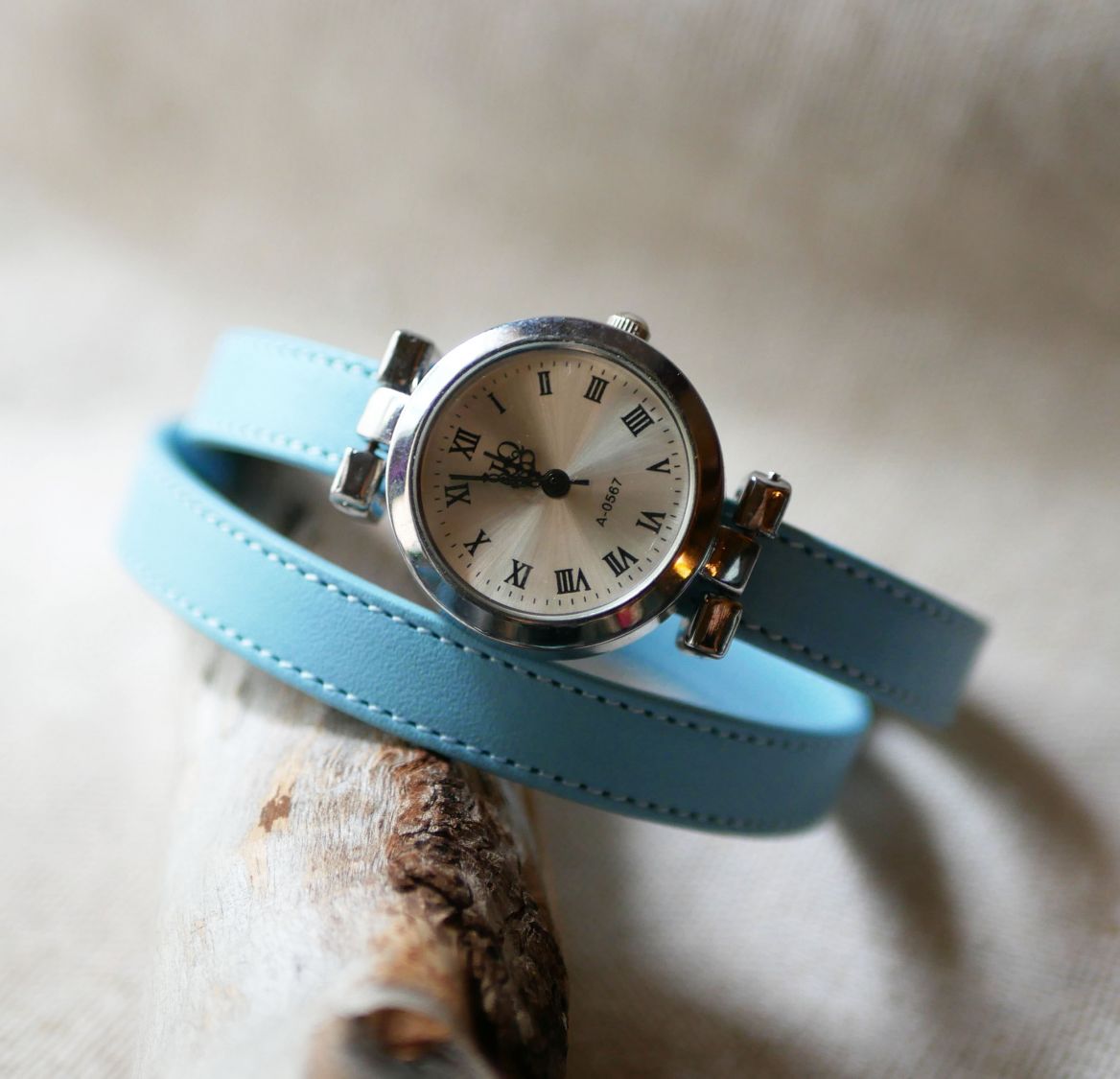 Une montre élégante, au bracelet double tour en cuir couleur bleu ciel (ou bleu glacier)