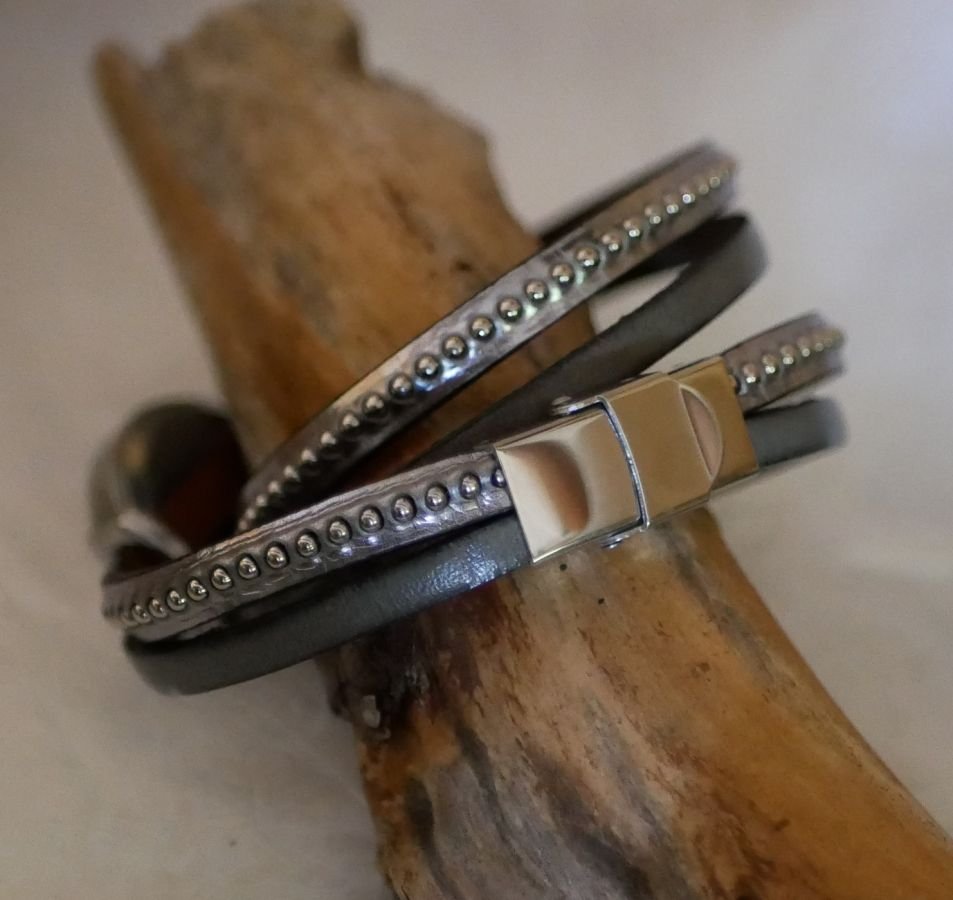 Montre femme cadran argenté double tour de poignet personnalisable en double cuir : l'un de couleurs gris aux billes argentées et l'autre de la couleur de votre choix.